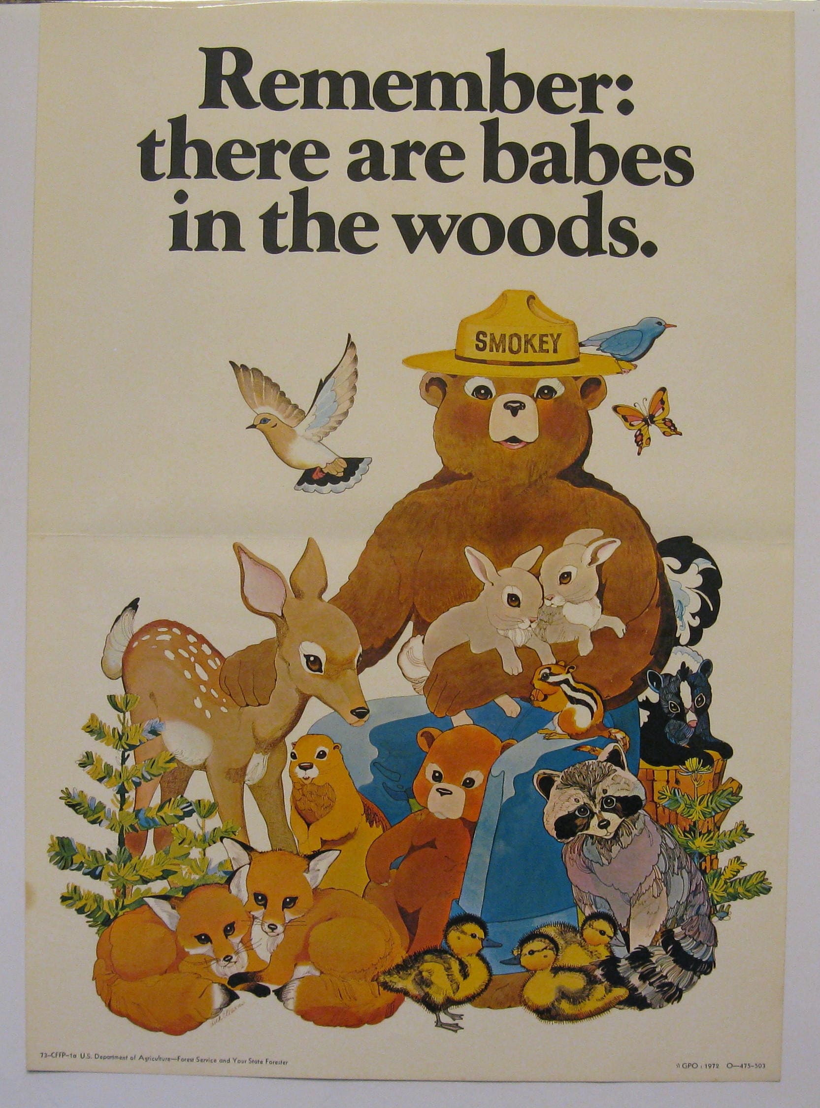This is an original Smokey Bear poster. It is not a reproduction and was printed in 1972/ Printed across the bottom of the poster: "73--CFFP--1a; U. S. Department of Agriculture--Forest Service and Your State Forester; GPO : 1972." This vintage poster is in very good condition. This poster is printed on paper and is not cardboard as some Smokey Bear posters were. These were intended for short-term use and not many of these survived the decades after printing. However, it was folded at one time in the middle and has a slight crease across the middle of the poster. The crease is not very noticeable and does not detract from the image. This poster comes from an estate. This would be a great addition to Smokey Bear collectors or for those wanting a piece of original American history. This would also make a great addition to a children's room showing the importance of wild land management.